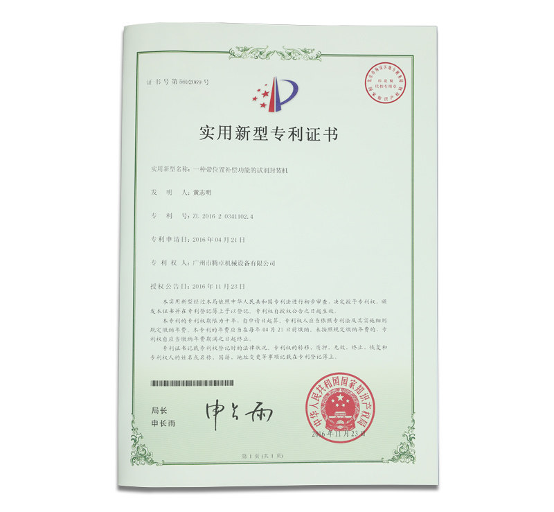 騰卓機械專利生產(chǎn)證書,專業(yè)制造包裝設(shè)備的生產(chǎn)廠家,全自動及半自動的洗瓶機,烘干機,灌裝機,旋蓋機,貼標(biāo)機,套標(biāo)機,打碼機等非標(biāo)定制自動化包裝生產(chǎn)線